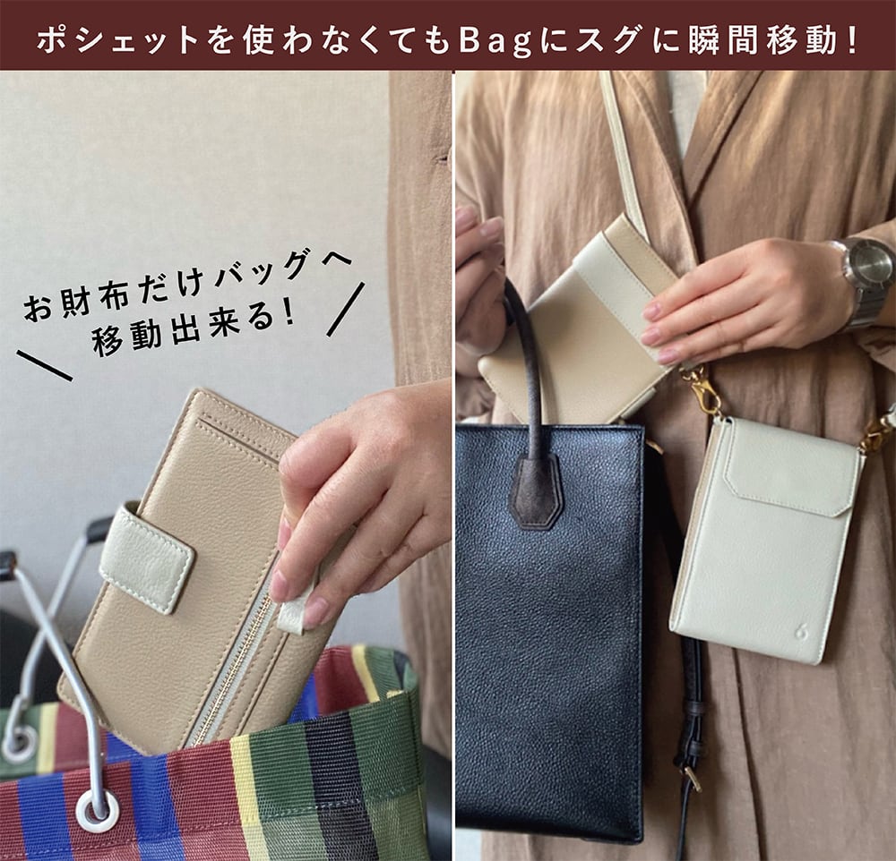スマホケースのフラップを開けてお財布の表バンドに通して簡単フュージョン!面ファスナータイプなので簡単に素早くお財布だけ取り外しが出来るので中身を入れ替えずその日の気分やライフスタイルに合わせて持ち運びが出来る3Wayタイプのスマホショルダー+お財布=「スマホウォレットポシェット」です!