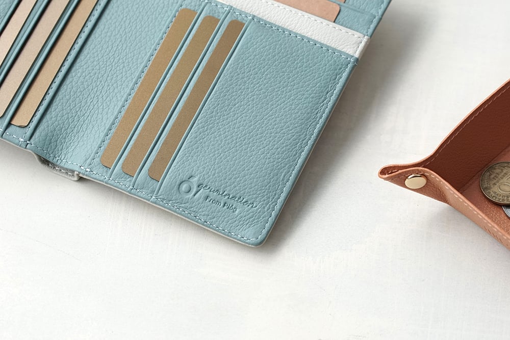 お財布は、お札ポケットを手前に配置したのでお札を入れたときに深くなりすぎず出し入れしやすい設計にしました!カード収納も充実しているので、お財布としても十分な収納力があります。